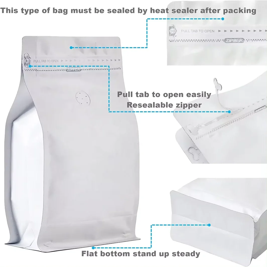 Side gusset coffee pouches with valve are made from 100% biodegradable PLA material, featuring a reusable zipper seal at the top. These eco-friendly pouches are perfect for packaging coffee, oats, nuts, spices, and other products, providing excellent freshness protection while supporting sustainability.